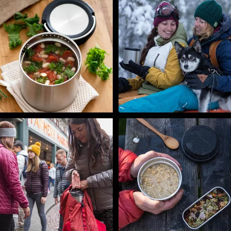 Outre son caractère isotherme, ce qu’on aime au sujet de cette boite Thermo, c’est sa taille : hauteur totale de 153 mm et diamètre total de 135 mm (diamètre intérieur : 127 mm). Le TKCanister Klean Kanteen a une contenance atteignant quasiment 1 litre : 0,95 litre plus précisément. Autrement dit, on peut stocker généreusement un plat entier pour une personne. Pour autant, le TKCanister passe très largement dans votre sac à dos et il restera même une place conséquente pour d’autres affaires de randonnée ou de voyage. Aucune fuite n’est possible : c’est une boite parfaitement étanche. L’avantage d’une boite alimentaire étanche, c’est que l’on peut transporter n’importe quel type d’aliments solides (chauds ou froids) et liquides (froids) en toute sécurité. La double paroi assure non seulement l’isolation thermique mais également le côté anti-brûlure : même si votre repas est bouillant, vous ne vous brûlez pas les doigts sur la paroi (celle-ci reste à température ambiante). Idem si vos aliments sont glacés : vous ne vous glacez pas les doigts. Il n’y a pas de transfert thermique entre l’intérieur et l’extérieur de la boite isotherme Klean Kanteen TKCanister. On aime également : sa grande anse métallique de transport (anse large et robuste). Compatibilité avec lave-vaisselle : oui.