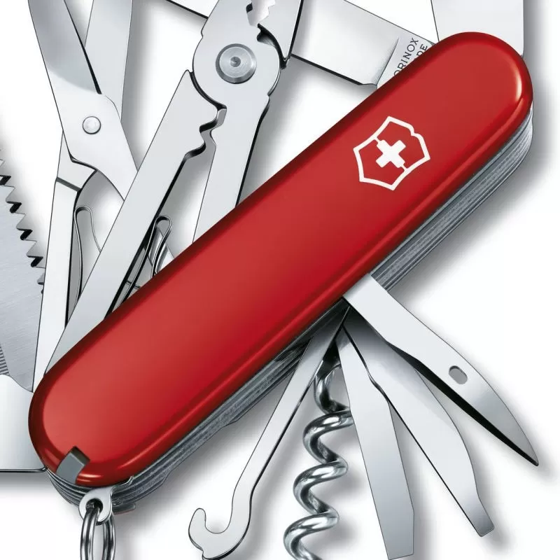 Le couteau suisse Handyman Victorinox offre 24 fonctions, dont les deux lames classiques (une lame de grande taille mesurant 7 centimètres et une lame de petite taille mesurant 4 centimètres), un anneau d’accroche, un poinçon alésoir muni d’un chas d’aiguille (pour coudre, percer et aléser), un tire-bouchon, un cure-dents, des pincettes, un ouvre-boîte doté d’un tournevis pour petite vis cruciforme, un décapsuleur équipé d’un tournevis plat et d’un plioir de fil électrique, un crochet porte-paquets multi-usages, une lime à ongles, un cure-ongles, un tournevis fin, une paire de ciseaux, une lime à métaux, un coupe fil et un serre-cosses. A cela s’ajoutent les fonctions vues précédemment : deux scies (une scie à bois et une scie à métaux), une pince et un ciseau à bois. Bon à savoir : à poids égal et taille similaire, le modèle Handyman est l’un des couteaux suisses les plus complets : c’est l’un des meilleurs modèles de la marque Victorinox. En résumé, acheter un couteau suisse Victorinox Handyman, c’est opter pour un couteau suisse réellement multifonction, une véritable trousse à outils, utile en randonnée, en trek, en camping, en voyage, en survie ou au quotidien.