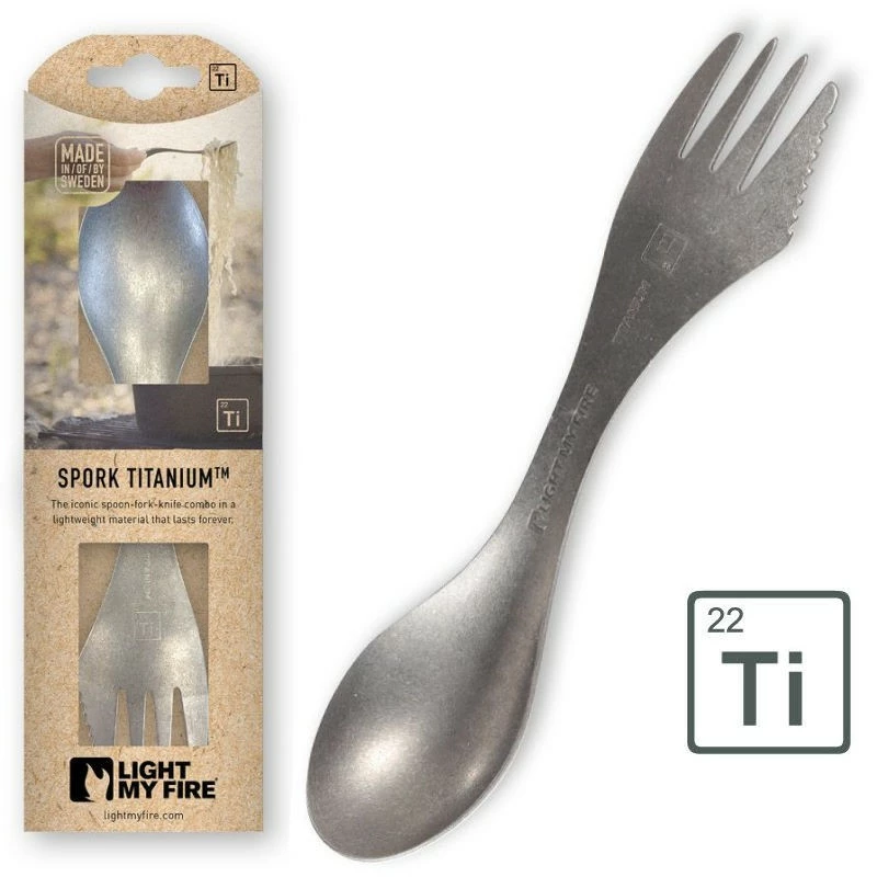 Léger (poids : 20 grammes), solide (matière : titane) et inoxydable (anticorrosion, nettoyage facile), le Spork Titanium de Light My Fire est un couvert multifonction très apprécié dans les milieux du trek et de la grande randonnée. Très pratique également en camping, en bivouac, en expédition, en voyage ou au bureau, le Spork Titanium peut s’emmener et s’utiliser partout. Reprenant le design du Spork originale, cuillère, fourchette et couteau en un seul couvert, son encombrement est optimal : il ne prend que peu de place dans votre sac à dos, popote ou Lunch Box. Les dimensions du Spork en titane s’élèvent à 170 mm de long pour 39 mm de large et 20 mm de profondeur.