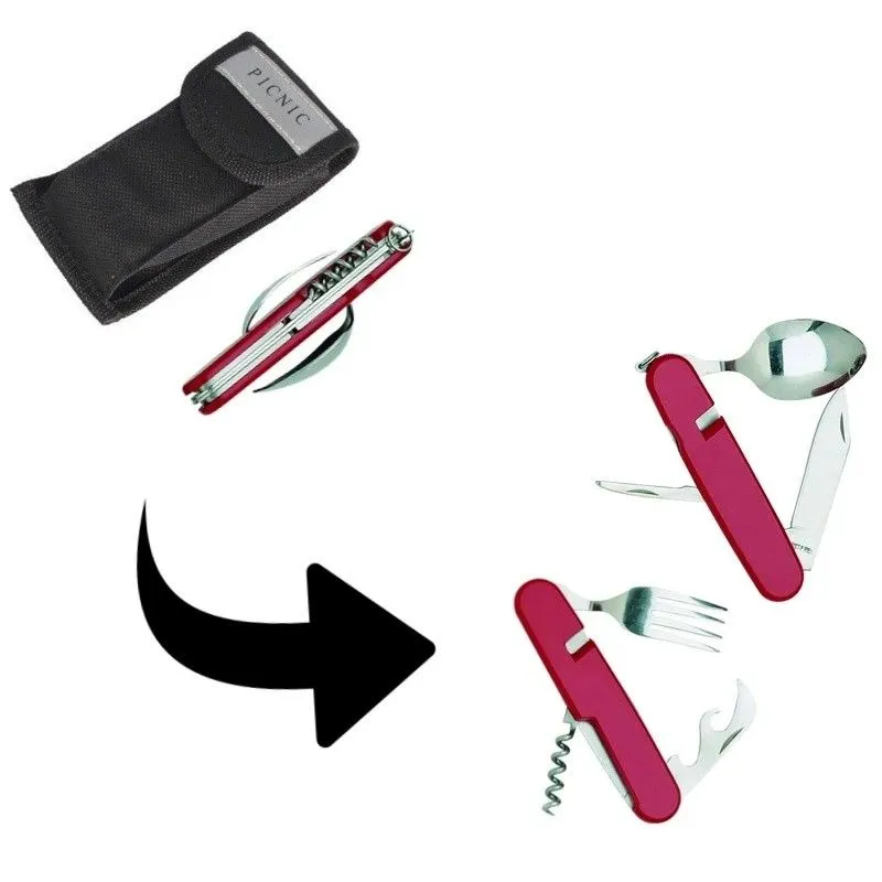 Le couteau avec couverts camping Herbertz Picnic rouge en détail :