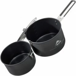 Deux popotes en une, câest possible avec la popote MSR Alpine 2 Pot Set. Comme son nom lâindique, il sâagit dâun set de 2 casseroles. Lâavantage est que le tout sâempile et sâemboite de façon Ă gagner un maximum de volume. Ainsi, on a une casserole de 1,5 litre et une casserole de 2 litres auxquelles sâajoute un couvercle qui peut servir Ă lâune ou Ă lâautre et peut mĂȘme servir dâassiette. En bref, on a un vrai gain de place et une vraie polyvalence.