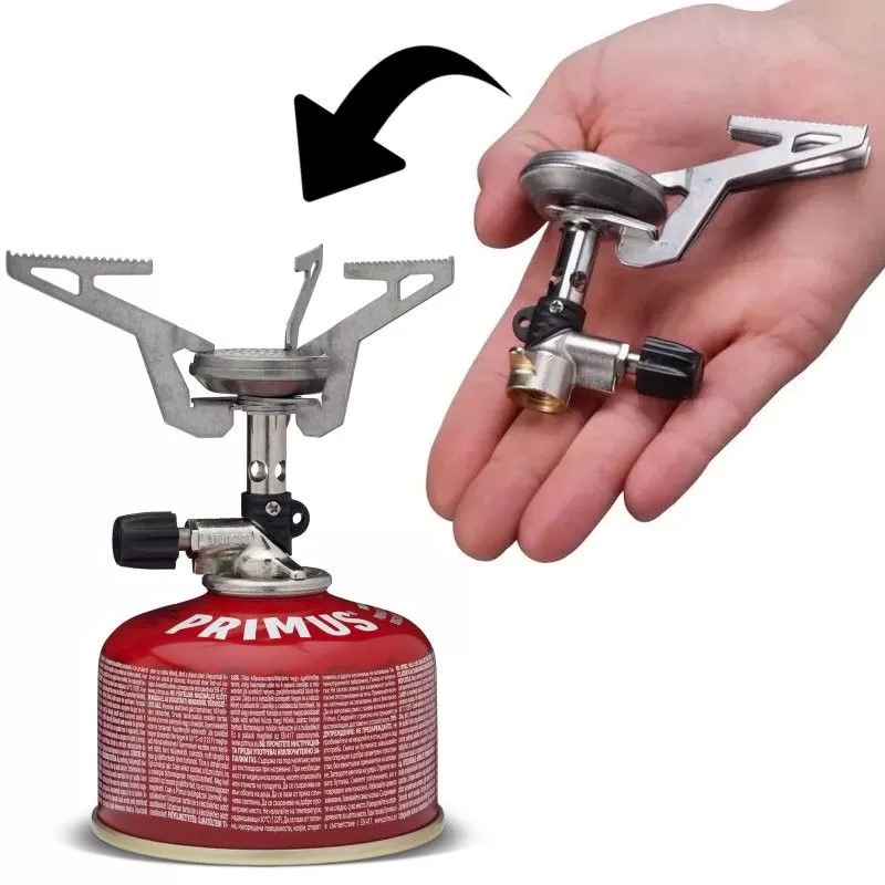 Parce que c’est un réchaud pliable, l’Express Stove de la marque Primus peut tenir dans la paume de votre main : plié, il mesure 87 mm de long, 80 mm de large et 40 mm d’épaisseur. Déplié et installé sur votre cartouche de gaz, c’est un vrai réchaud de camping minimaliste avec un support de casserole (à 3 ailettes dentelées) suffisamment stable. Il ne pèse que 82 grammes et il se range à l’intérieur d’une mini housse (housse fournie). Allumé, il offre une puissance maximale de 8900 BTU ou 2600 W (pour une ébullition en 2 minutes et 30 secondes). Bien sûr, la puissance de flamme est réglable : molette intégrée au réchaud. En ce qui concerne l’alimentation en gaz, ce réchaud compact est compatible avec quasiment toutes les cartouches de gaz du marché : n’importe quelle cartouche de propane, de butane ou d’isobutane ayant un pas de vis (le pas de vis en question est universel). Il est donc très facile de trouver une recharge en gaz partout où vous voyagez.